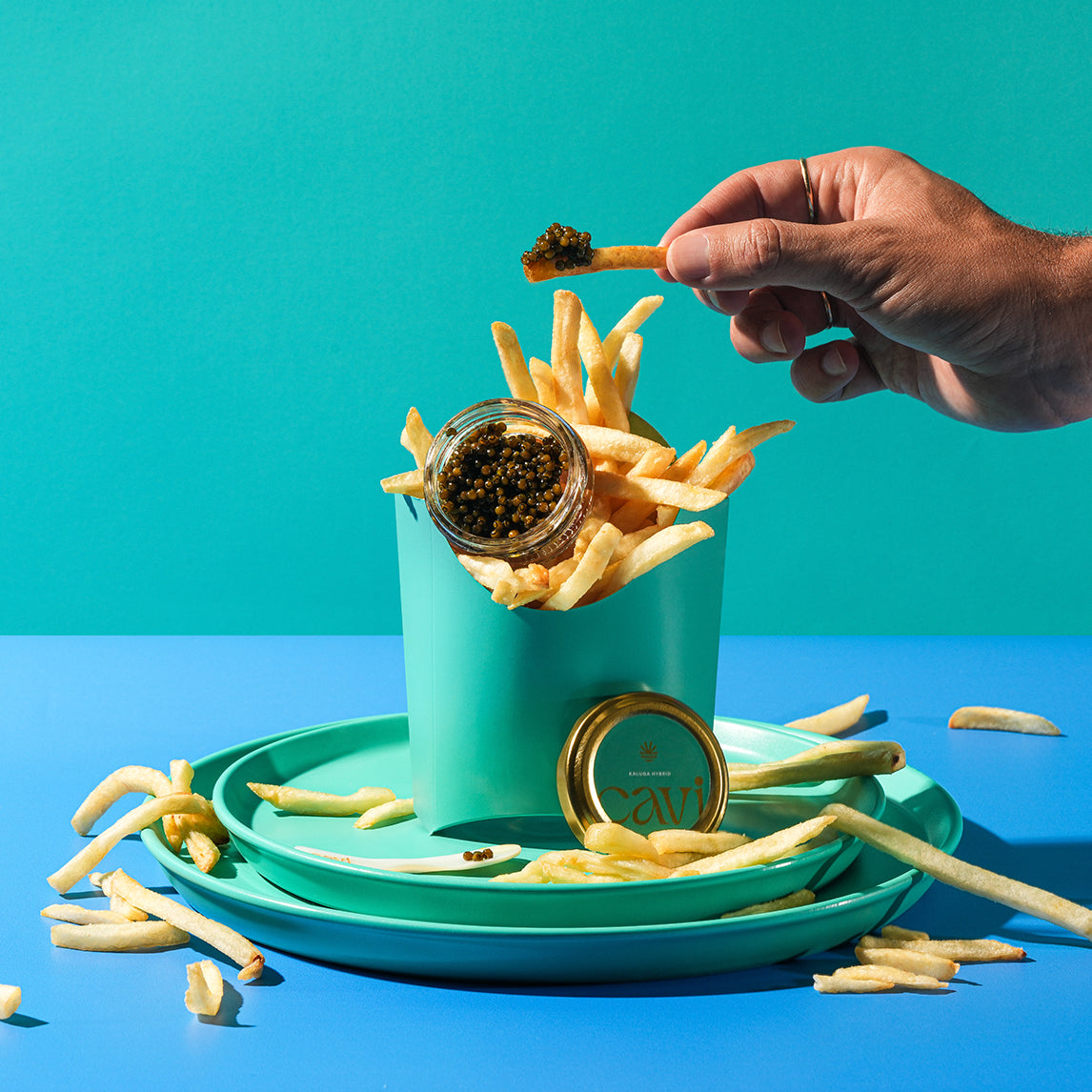 Caviar isn’t just for champagne toasts and silver trays anymore. With CAVI, it’s a vibe. Scoop it straight from the tin, stack it on a crispy chip, top it on crème fraîche and blinis, spoon it over soft eggs, swirl it into pasta, or crown a baked potato. Dollop it on pizza (yes, pizza), or keep it simple on a spoon and nothing else.